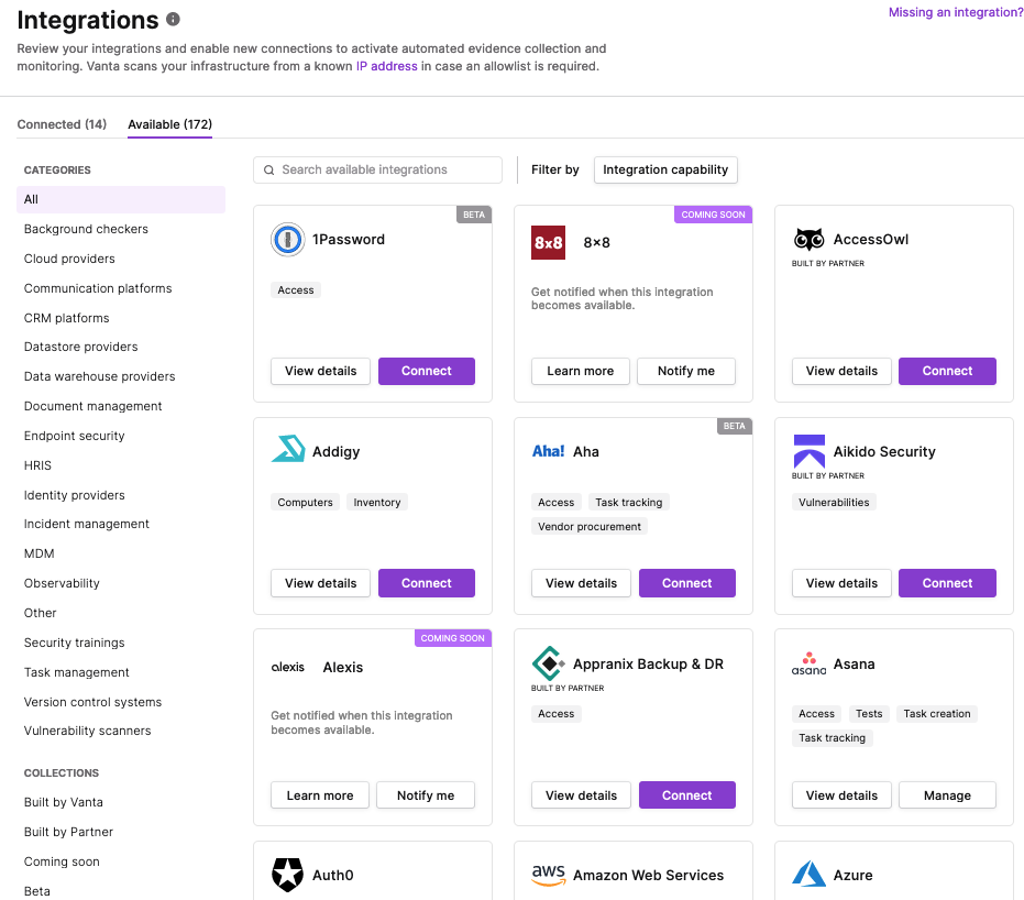 We deploy and configure Vanta for your environment: connect identity, cloud, devices, and ticketing; select frameworks; and map controls so you get a clear view of what’s passing, what’s failing, and why.